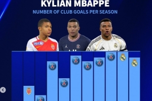 NBA直播网4月25日讯 《转会市场》统计了姆巴佩俱乐部生涯各赛季进球数情况,已连续6个赛季至少打进39球。本赛季在还剩6轮联赛的情况下,距离个人单赛季进球纪录仅差3球。