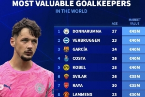 NBA直播网4月25日讯 《转会市场》统计了当前门将身价排名前15球员,曼城一门多纳鲁马居首。