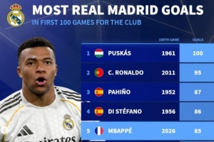 NBA直播网4月25日讯 皇马在本轮西甲1-1遭贝蒂斯绝平,姆巴佩首发出战,解锁个人皇马生涯100场里程碑。《转会市场》也统计了皇马球员百场进球榜。
