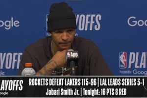 NBA直播网4月27日讯 火箭在主场以115-96击败湖人,将系列赛比分扳至1-3。赛后史密斯接受了媒体采访,以下为采访全文。