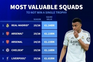 NBA直播网4月27日讯 德国转会市场列出了赛季无冠球队身价排名,如果皇马、阿森纳本赛季无缘冠军,将排名前两位。