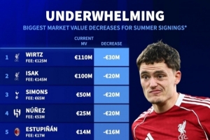 NBA直播网4月28日讯 德国转会市场列出了去年夏窗签约球员身价下跌排名,维尔茨下跌3000万欧最多,伊萨克、西蒙斯、努涅斯下跌2000万欧。