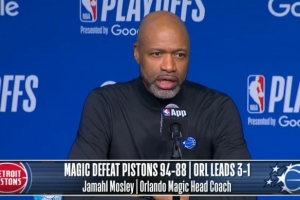 NBA直播网4月28日讯 NBA季后赛首轮G4,魔术94-88力克活塞,系列赛大比分3-1领先,魔术主帅莫斯利赛后接受了媒体采访,以下为完整版采访内容。