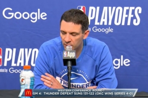 NBA直播网4月28日讯 NBA季后赛首轮G4,雷霆131-122胜太阳,大比分4-0晋级。赛后雷霆主帅戴格诺特接受了媒体采访,以下为完整版采访内容。