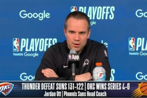 NBA直播网4月28日讯 今日NBA季后赛首轮,太阳122-131不敌雷霆,0-4遭淘汰。赛后,太阳主帅奥特接受了媒体采访,以下为完整版采访内容。