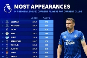 NBA直播网4月29日讯 德国转会市场统计现役球员当前俱乐部的英超出场次数,并列出榜单,科尔曼、皮克福德、萨拉赫前三。